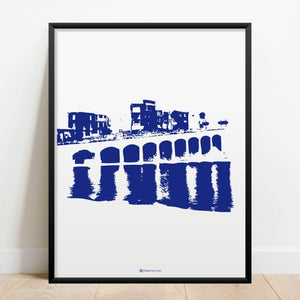 Illustration numérique stylisée des arcades de Banyuls et des premières maisons du quartier du Cap d'Osna pour afficher son terroir préféré à la maison ou au bureau. Bleu marine sur fond blanc.